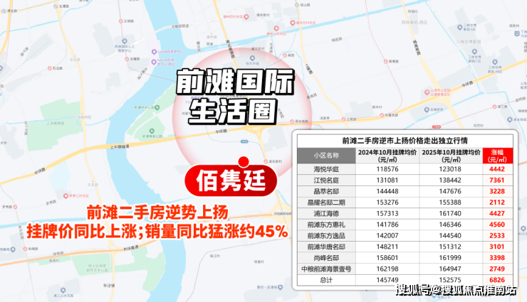 价格上,在约98%板块挂牌价同比下降的当下,前滩多数小区仍保持价格坚挺;销量上,今年1-10月二手房成交约230套,同比大涨约45.6%,印证板块吸引力。
