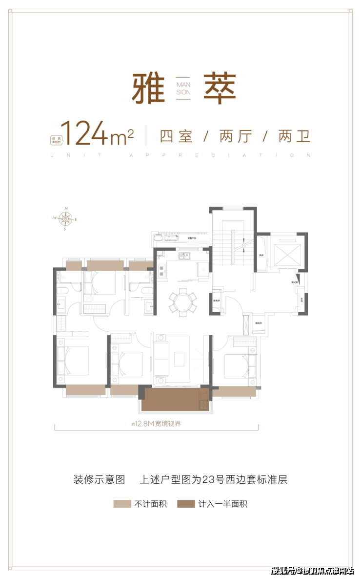 建面约124㎡的4房2卫户型,通常来说是紧凑型的户型。但得益于无连廊+飞机户型带来的高得房率,这个户型的尺度感非常惊人。就拿餐厅而言,这个户型可以放下一个5-6人的圆桌,可以满足一大家子围坐大圆桌吃饭的需求。另外,项目是4房中少有的4开间朝南、3房朝南的设计,采光度十分出色。