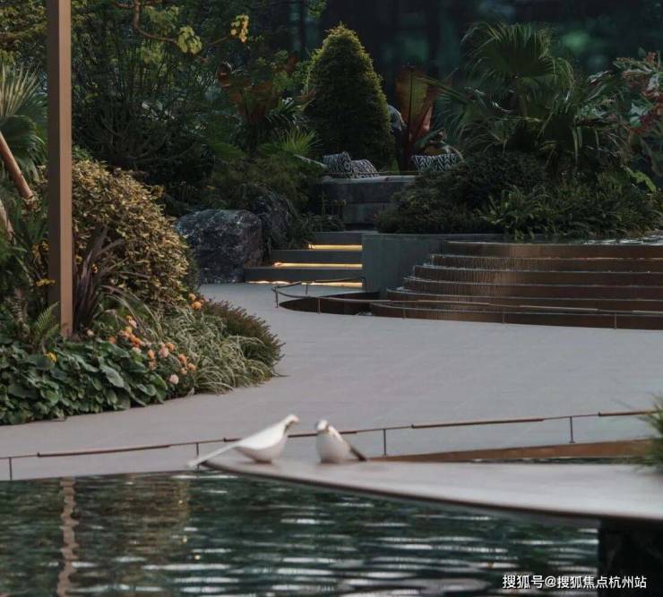 首先,大华公园柏翠利用12级叠水、2座树池、9步水上汀步,运用六重造景的手法打造近500平的中央水景!