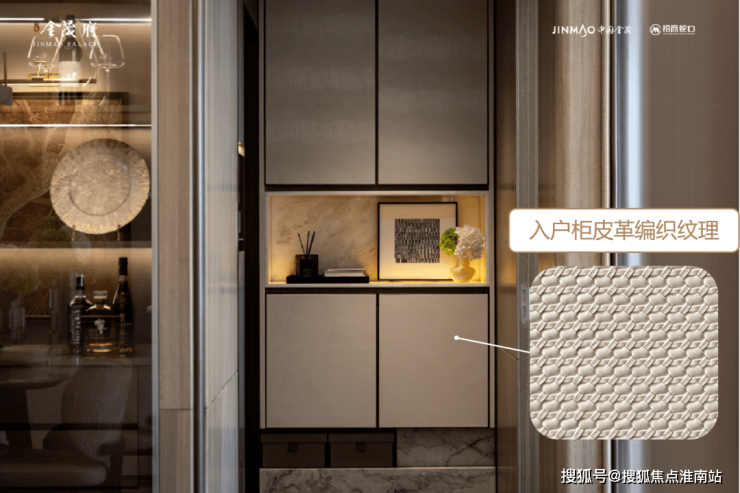 入户玄关,采用皇家白玉的台面,玄关柜的上部门体采用全屏BV式的皮革包裹,有质感有审美。