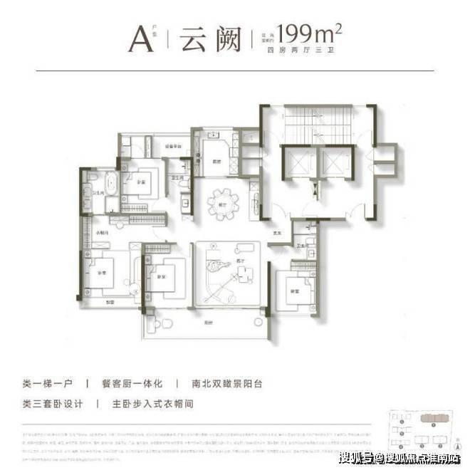 像即将首开的建面约199㎡A户型,类一梯一户的私密体验,带有约10㎡独立电梯厅。
