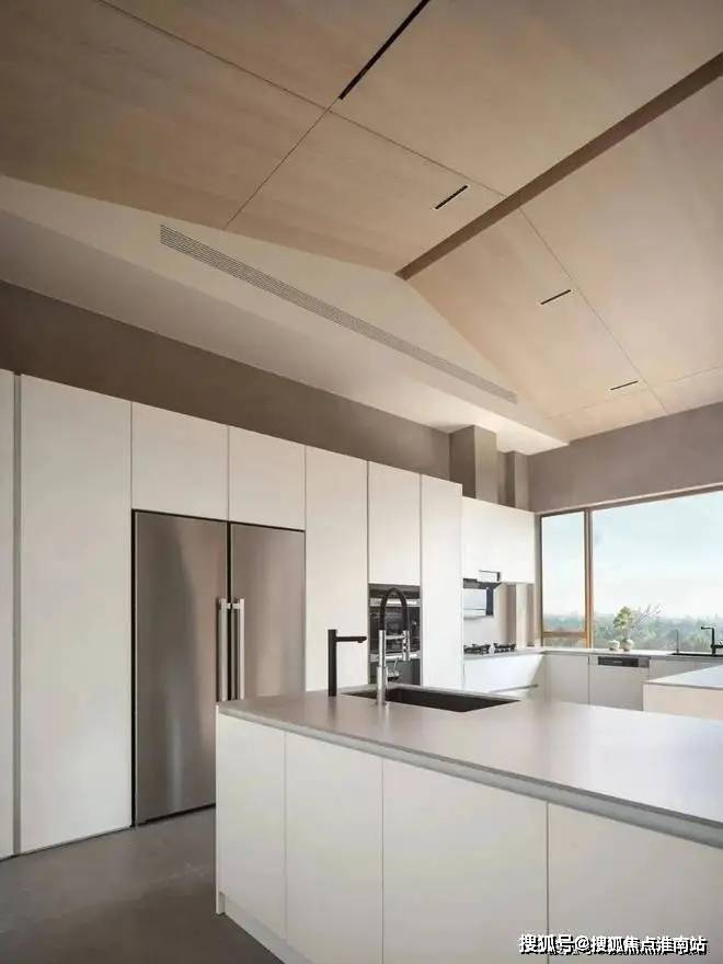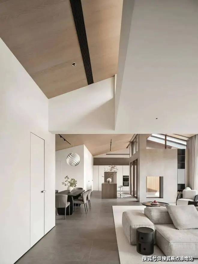 倾斜的吊顶和特意做出的错落 “断层”,增强了空间的纵深感。这种感觉不是来自单一方向,而是四面八方的张力共同形成的。