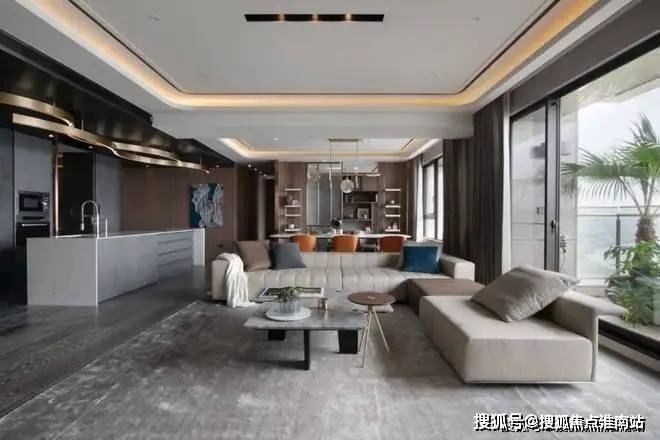 ▲大横厅的空间,在开放式的空间格局下,显得格外的大气高级。吊顶上加入独特的造型设计、结合灯带与筒灯的组合照明方式,布置优雅端庄的家具陈设,也显得格外的优雅舒适。电视墙是地毯+大理石背景墙的设计,中间壁挂上电视机,给人的感觉是现代优雅而大气。