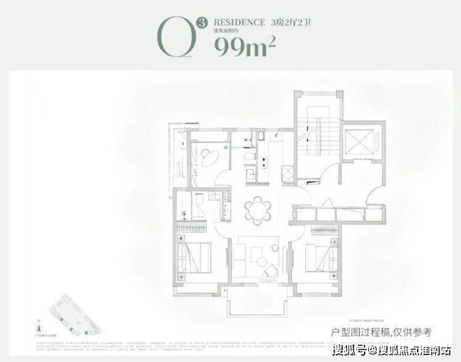 厨房、餐客厅、阳台形成直线通风廊道,南向三开间+宽尺客餐厅,轻松容纳二胎三代家庭的日常;