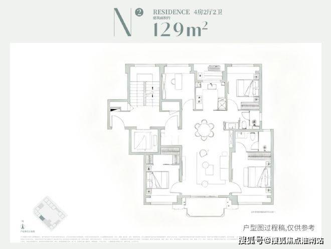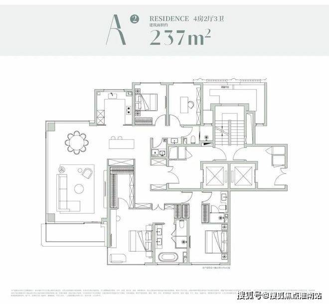 经典的四叶草布局,四开间分布在四角,兼顾私密与互动,是二胎家庭的优选。