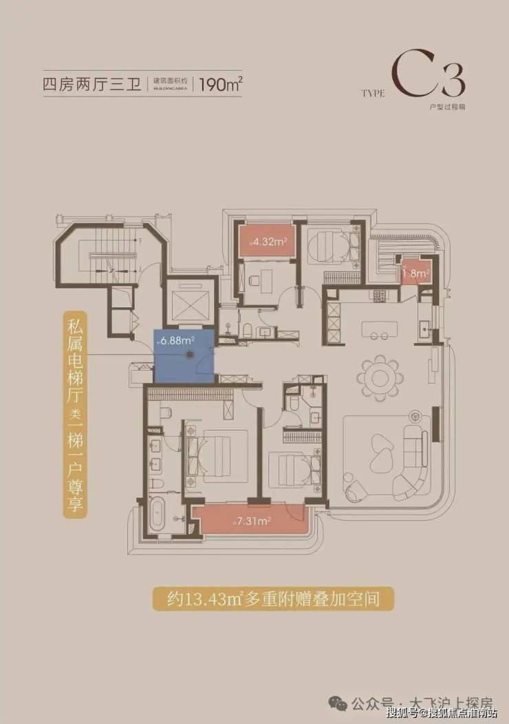 建面约190㎡的4房3卫户型 ,南向双套房的设计,保障了居住的私密性。