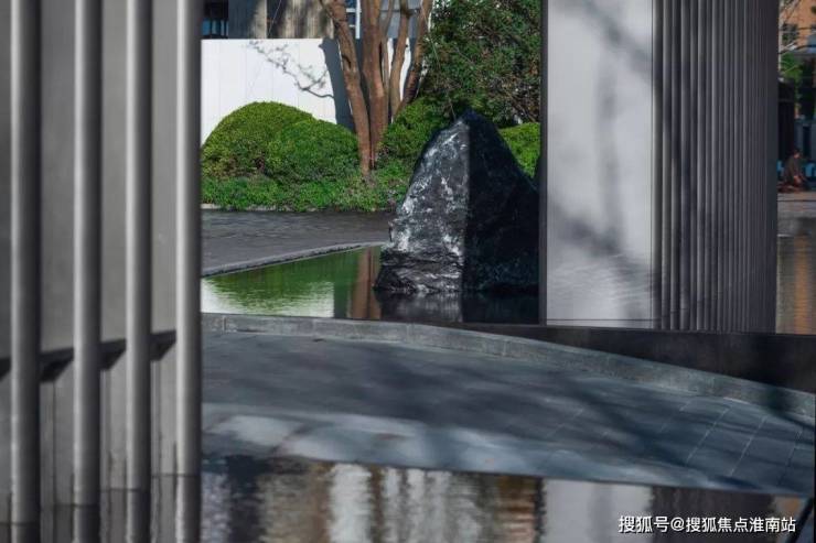 在入口景墙背后的水景之上,伫立着三块景石,通过对景石的形状进行模拟推敲,摹写中国传统文化中的“一池三山”,彰显东方文化意蕴之美。