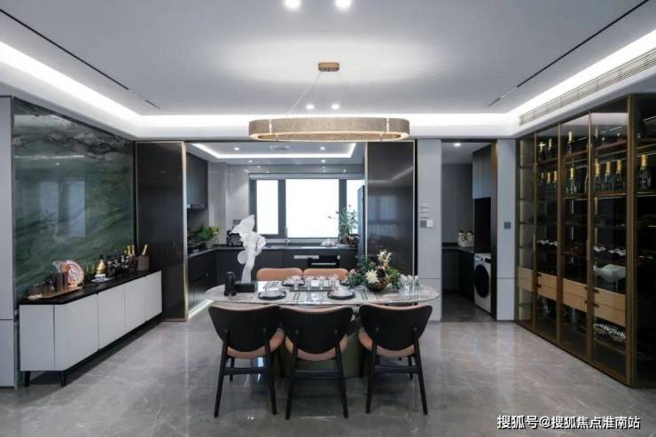 客餐厅以大餐桌为界,中西双厨奢配,独立餐厅营造出生活仪式感,增加家人之间感情交流,让亲密连接成为惯性日常。
