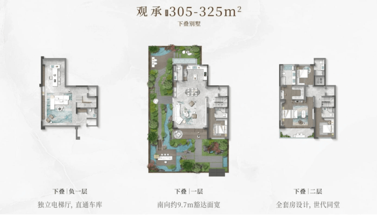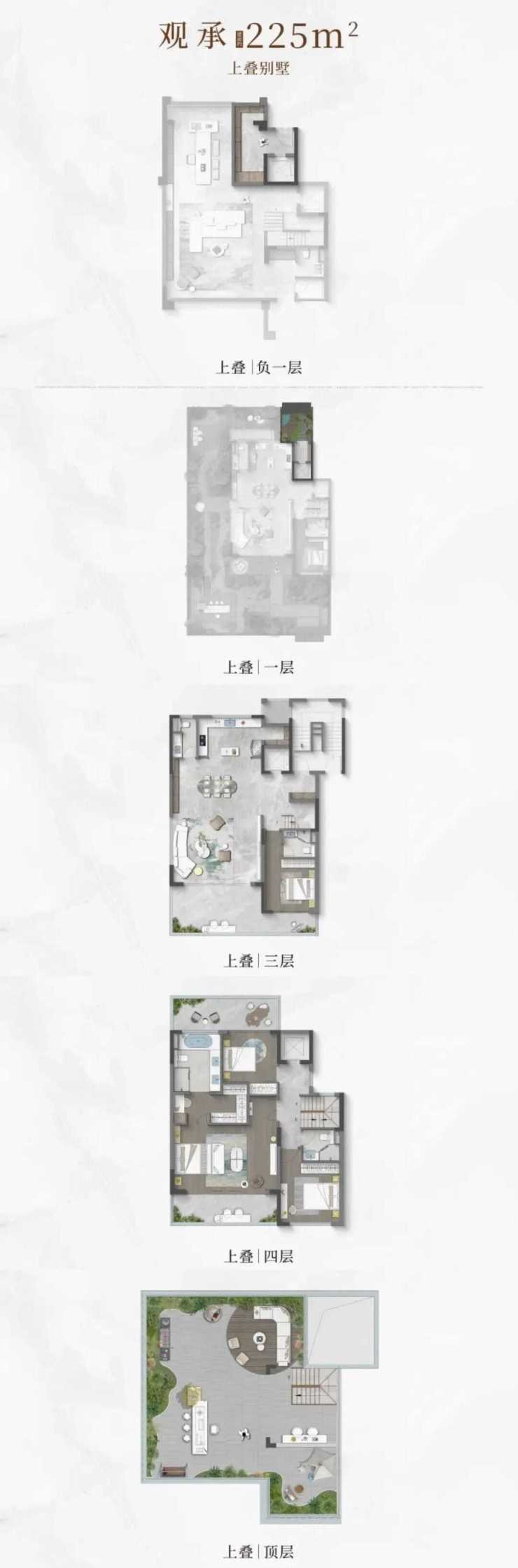 叠加别墅「观承」:约220–325㎡(上叠享露台,下叠带地下室)
