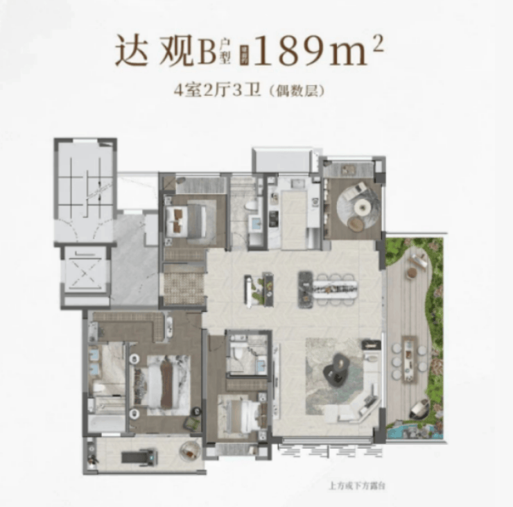 上叠225㎡:总价779万起,四房三卫,独立电梯厅+私享入户花园,南向露台约110㎡(含屋顶露台)。