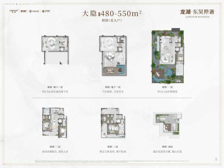 480–550㎡联排「大隐」:独门独院,毛坯交付,挑高地下空间 + 屋顶露台,私家庭院最大约310㎡
