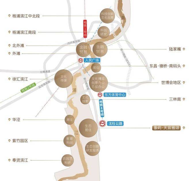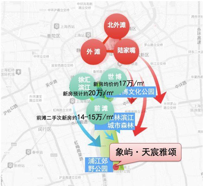 从上图可见,这两个滨江黄金三角的商业、产业、生态资源就在闵行浦江的正上方。但其房价早已是高攀不起,世博17万/㎡、徐滨冲20万/㎡,前滩二手房价已达14-15万/㎡(数据来源:链家网)!对比之下,仅6站地铁距离的浦江板块,显然性价比更高,未来潜力巨大。而且象屿·天宸雅颂占据黄浦江中上游生态链的黄金中轴,前景可期!