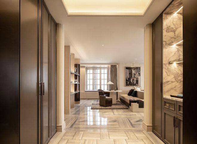 进入室内的入户玄关收纳空间,地面采用静雅棕、宝格丽兰石材拼花设计,古典回形波打+实心铜条的搭配增强入户尊贵感。右侧是山水白奢石的开放格,左侧是行李间,通过暗门的做法,将功能结合进去,强化了归家的仪式感。