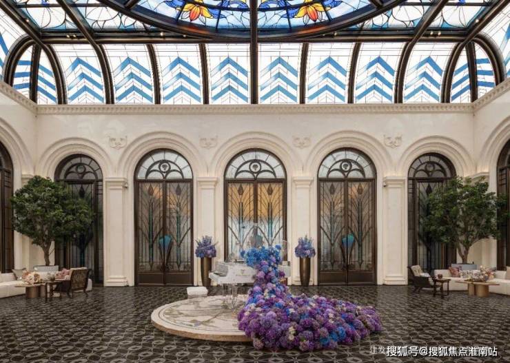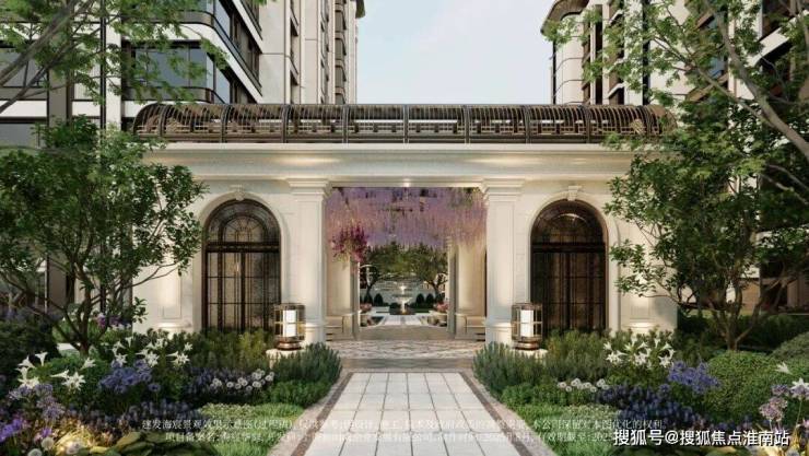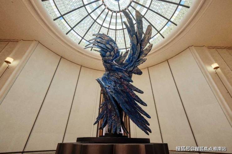 以玉兰门庭—迎归大堂—莳花荟为主轴,敬献步履生辉的归家艺旅:玉兰门庭如繁花盛绽,尊华瑞鳞水景聚运生财,双尊铜狮镇守家宅;迎归大堂流转光影艺韵,百羽栖澜艺术雕塑、芦海宸韵非遗绣作流淌摩登气韵;莳花荟中央会客厅移步异景,献映会客、休闲等雅会。