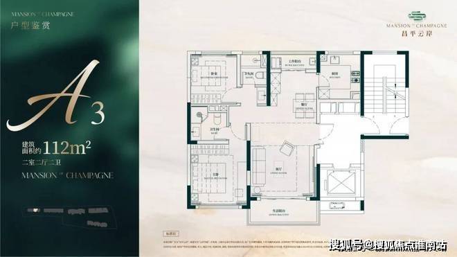 建面约112㎡2房2厅2卫户型▼