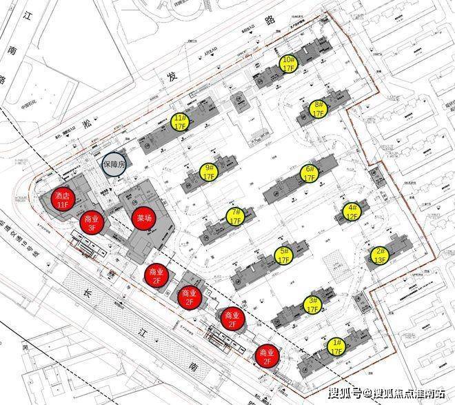根据设计方案显示,项目拟建11栋12-18层可售住宅,总户数876户,可售住宅约807套;另需建设1栋保障性住宅房,靠近长江南路一侧规划有酒店、商业、菜场、社区食堂等业态。