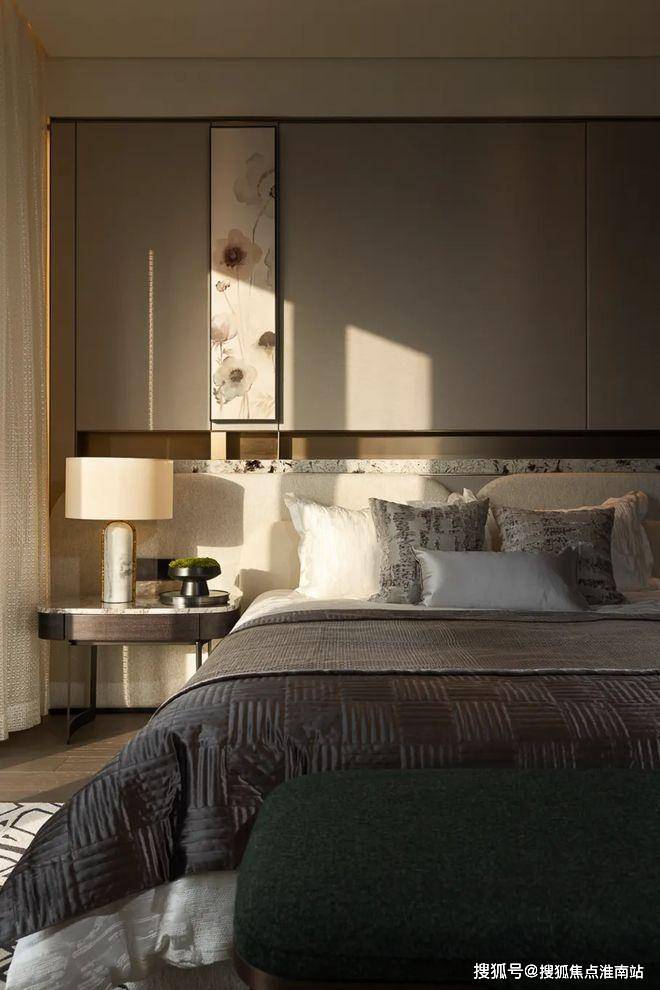 主卧背景墙内嵌金属线条,既是点睛装饰,又巧妙拉伸空间纵深感。