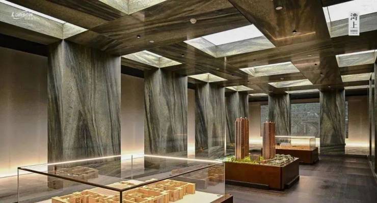 龙盛荟馆的接待处设计:空间讲究对称性、秩序感,暗绿纹哑光、温润的石材+仿铜金属板,调性和仪式感极佳,家具的选品又富有居家轻松氛围,有种俱乐部的感觉!