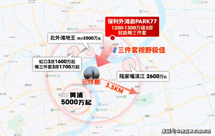 保利外滩启PARK77距离陆家嘴三件套直线距离约3.5公里。以三件套为圆心,环顾这3.5公里范围内的新盘,可以得出几个极具冲击力的结论: