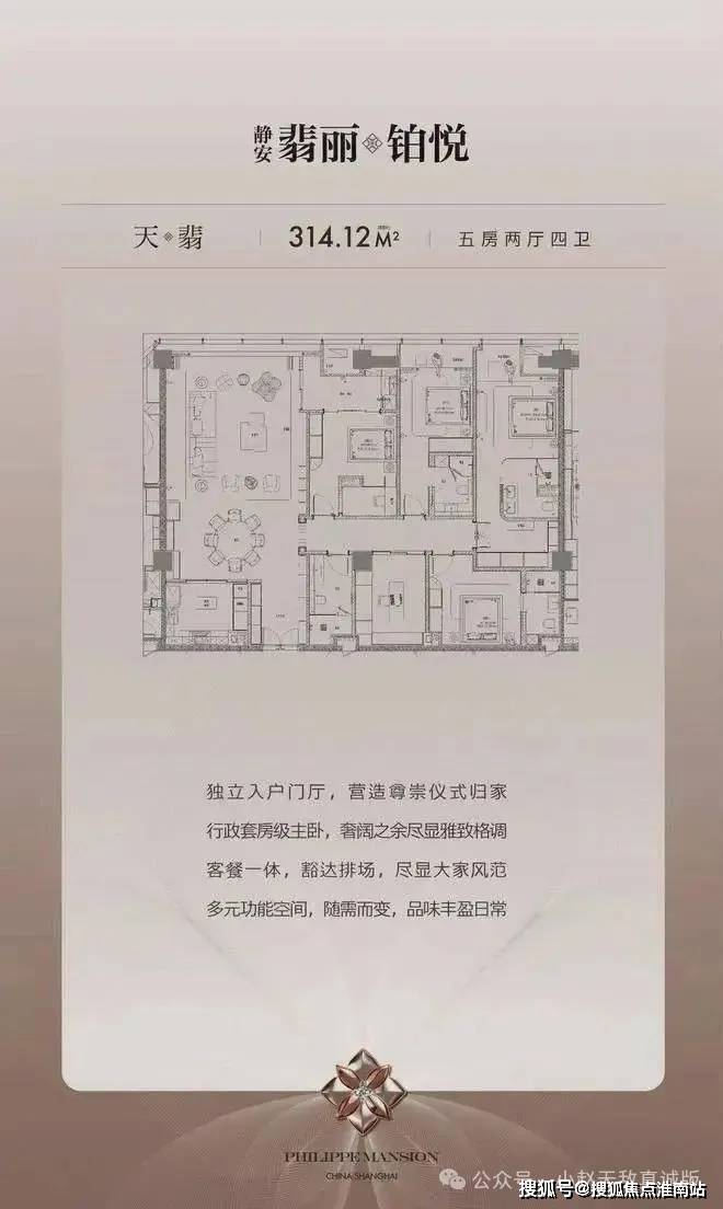 - 天翡314㎡:5房2厅4卫,独立入户门厅+行政级主卧套房,客餐一体设计彰显大宅风范。