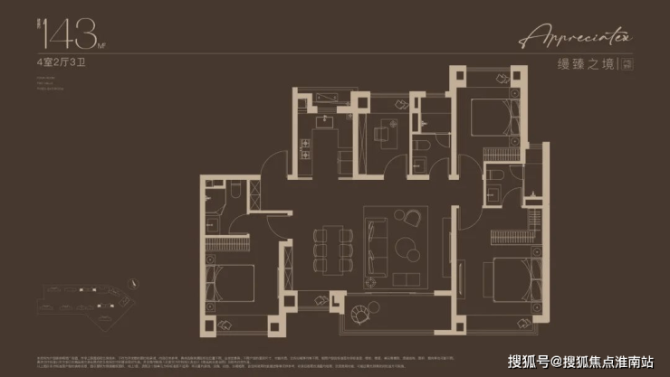 建面约 143㎡的四房,四开间全明,适合三代同堂,各有私密空间;