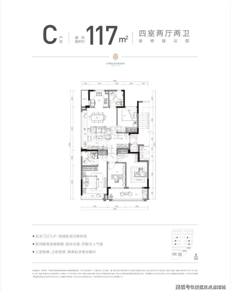 ①建面约117方户型新增了 圆弧吊顶的设计,起到视觉延伸的作用,从而起到提升空间感;
