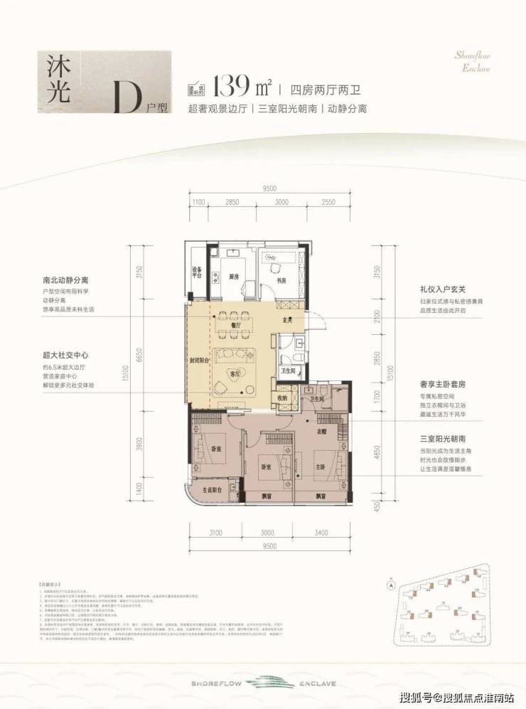 一镜到底视频:建面约139方D户型,四房两厅两卫: