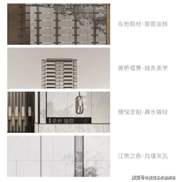 保利姑苏瑧悦取法苏州园林的廊桥框景线条美学,演绎为框体线条造型和简洁舒展的立面肌理。在地取材,运用质朴拙雅的御窑金砖,提取粉墙黛瓦的江南之色,定制兼具东方韵味和现代质感的蟒水纹,呈现与众不同的东方韵律和建筑表情,让家成为城市中一眼的确定。