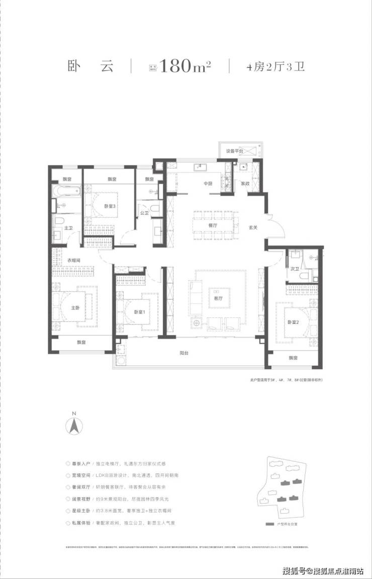 四房两厅三卫,作为洋房的得房率很高,步入样板间就能感受到。约6.95m的横厅的开阔性,南向双套房,主卧开间约3.7米,次卧约3.4米,客卫落于两个北次卧的中间,处处彰显细节。