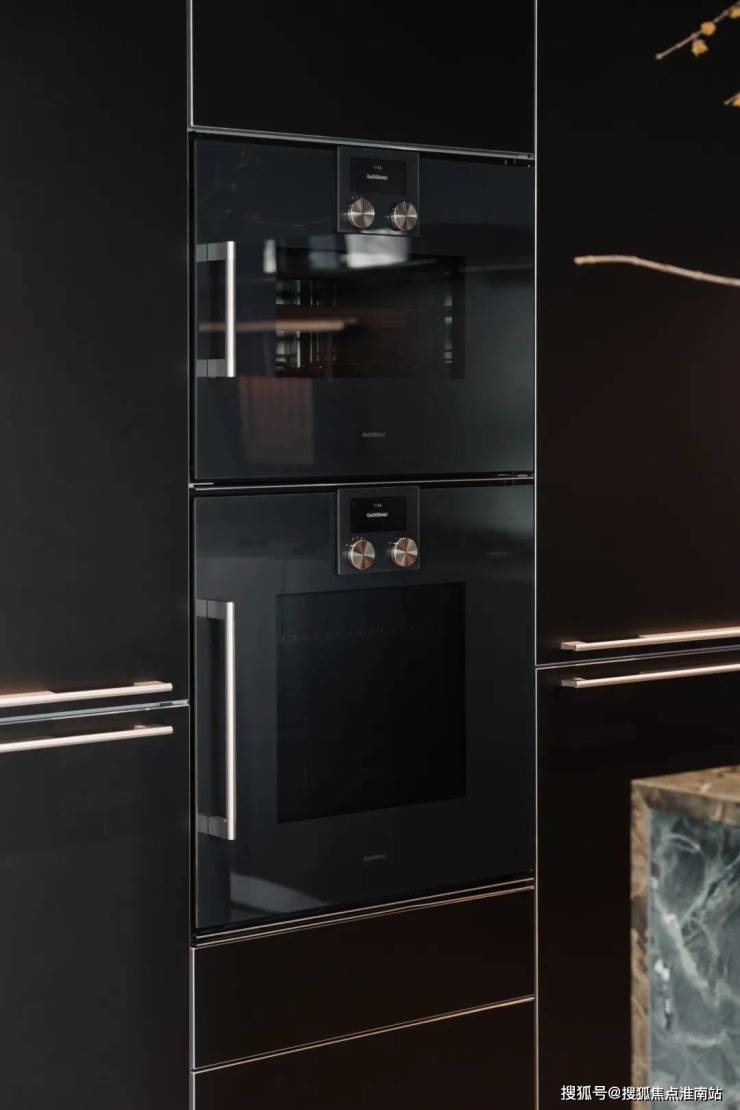 西厨岛台选用亚马逊绿岩板打造,搭配金属质感推拉门,高审美艺术性表现力满分!