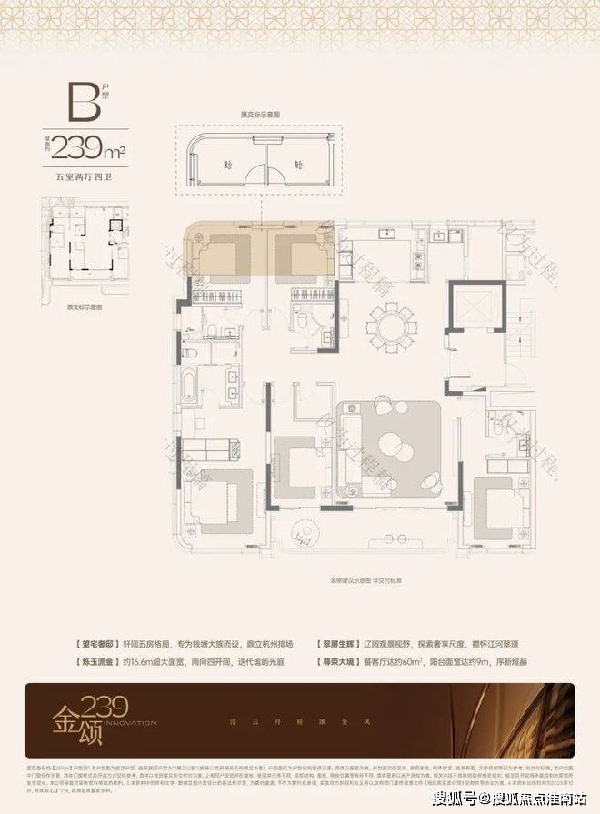 1#:主力建面约239方,五房两厅四卫格局,控总价,尺度感和功能兼具。
