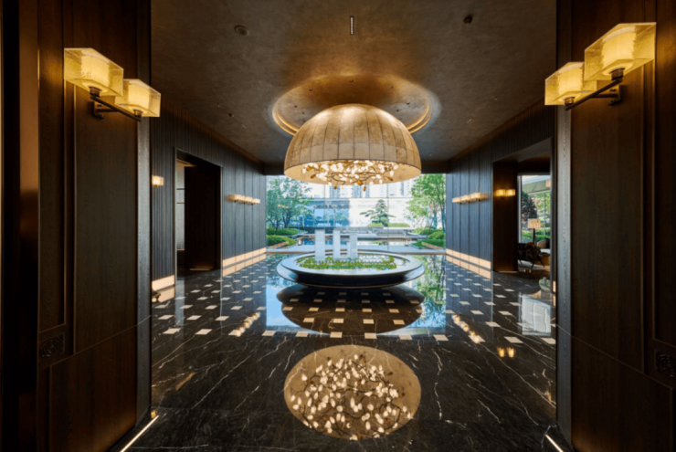 豪华酒店式门头,是整整用了一年时间才打磨出来的。香槟金吊顶,镌刻精致龙鳞祥云纹,细节处彰显高贵;通透质感的玻璃屏风与景观水系,两侧沿中轴展开,极致恢弘。