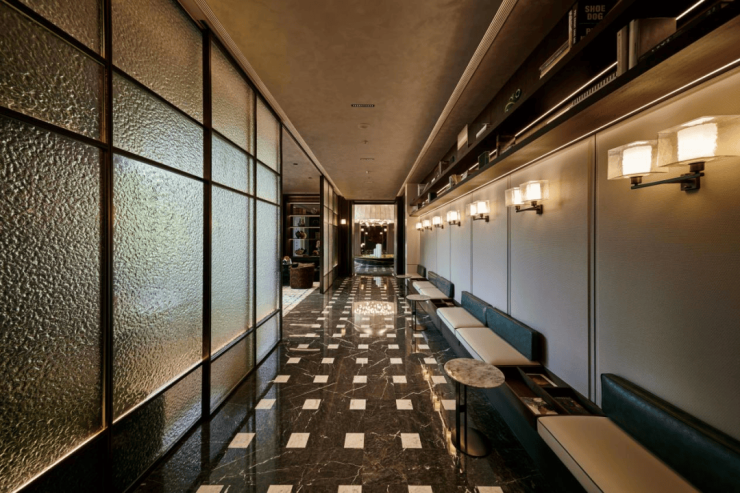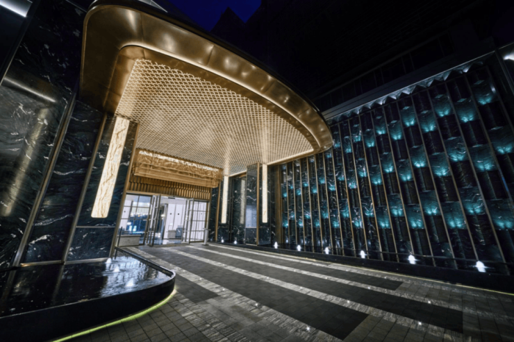 门庭巨幅奢石景墙,与光影交织,尽显奢雅。并且它还不是普通奢石,它的等级更高。每一块「百达翡绿」都是精挑细选,几何的构建、才有了现在如翡翠肌理的立体效果,这是普通石材铺装完全不能比拟的。