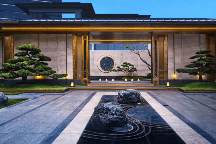 越级产品的营造不光在美学馆,更在具象化的产品中落位。滨水著品建筑形态以新宋风形制,呈现出高级的“精致度”,外立面甄选宝格丽酒店同款保加利亚进口维纳多石材,大面积超白玻以及极致窗墙比设计,实现景观价值提升。