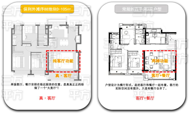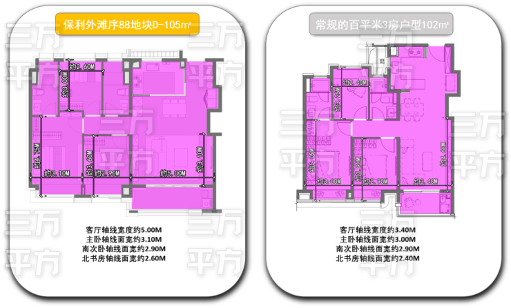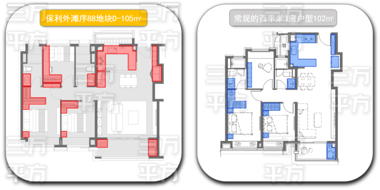 从以上的数据对比可以看出,如此高的空间“使用率”,百平米三房中的“突破级卷王”,【保利•外滩序BUND88】建面约105㎡D户型绝对是名至实归。