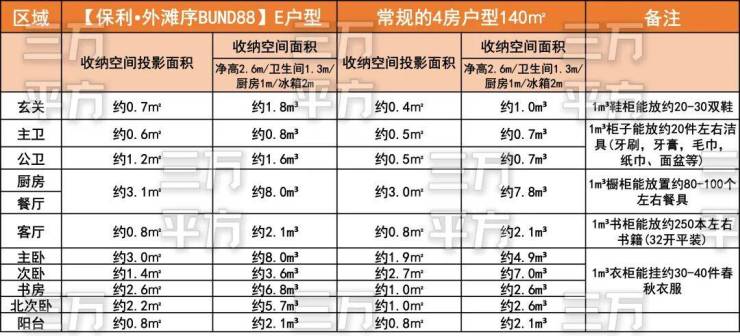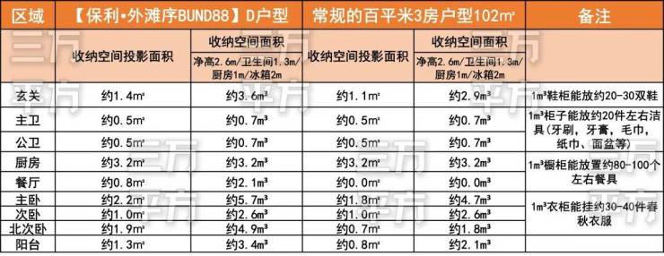 三万平方特意为大家详细分析各个部分收纳的空间大小,同时罗列了收纳物品一般情况作为参考对比。