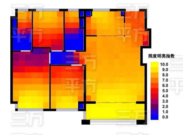 颜色代表采光效果,黄色最亮,蓝色为暗。