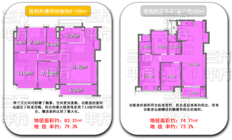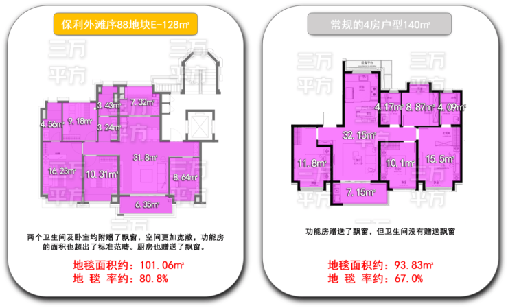 因为本户型的①公摊面积小,②阳台和飘窗的赠送面积大(以上两点会在后面详细介绍),所以户型套内地毯面积得到了双重优势加持!