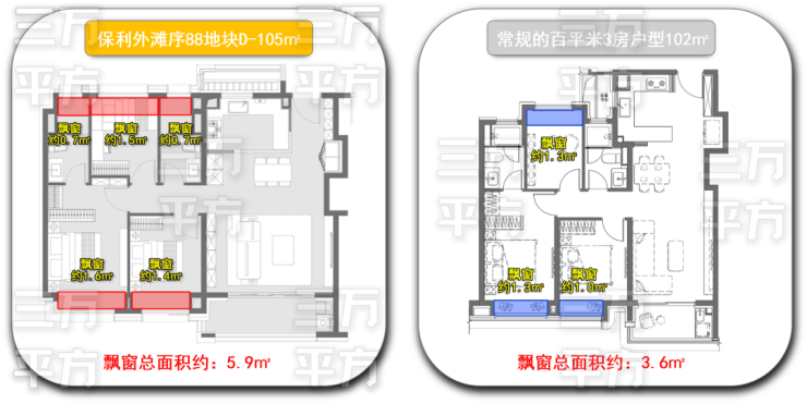 我们先来看一下数据的对比。【保利•外滩序BUND88】D户型在飘窗部分就有约5.9㎡的实用空间。比同面积段的户型要多了63.8%!