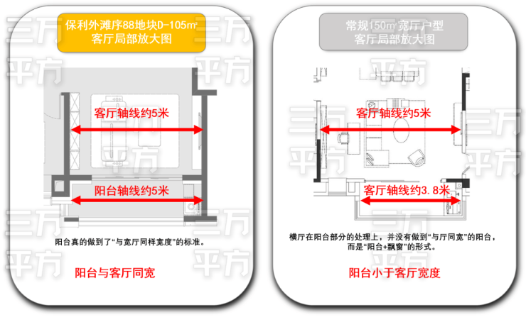 因为很多横厅在阳台部分的处理上,并没有做到“与厅同宽”的阳台,而是“阳台+飘窗”的形式。