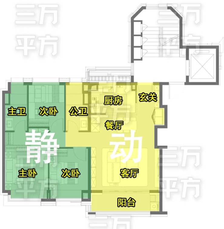 【动静分区】型式的优点在于分区明确,有更长的南向尺度和更短户型进深,能够达到更好的采光和通风效果。