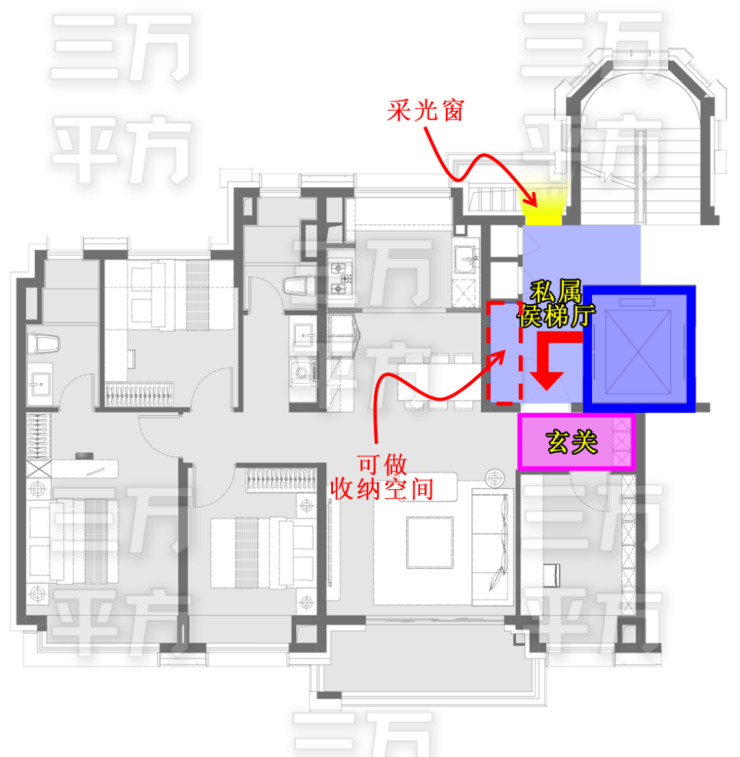 另外,因为电梯厅私属,几乎不受打扰。使得在电梯厅内也可以布置收纳空间,空间使用率和独享性再加分!