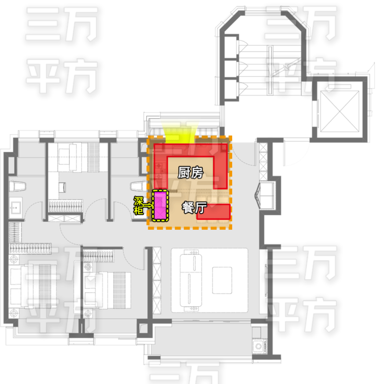 这里一定要和大家分享一下,这餐柜能够布置一个约0.6米深度的“深柜”!一般户型放置的餐边柜只能做浅柜,就放一下杯子、酒或小摆件。而本户型的深度,就能够放进家电,实用性一下子有了飞跃。这里还可以根据家庭需要,微改造为西厨空间,适应更个性化的生活~