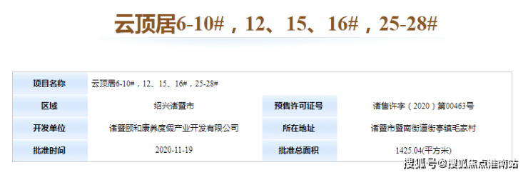 2020年11月19日,云顶居(推广名:和庄·云顶)领出预售证,预售许可证号为诸售许字(2020)第00463号,预售楼幢为6-10#,12、15、16#,25-28#,总建筑面积1425.04㎡。