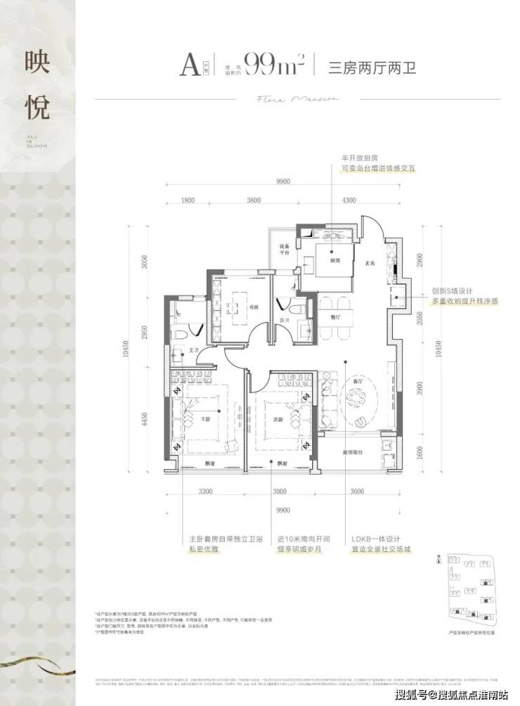 该边套户型,不仅有270度的采光视野,主/次/客卧三大开间并立朝南,“含阳光量”十足。