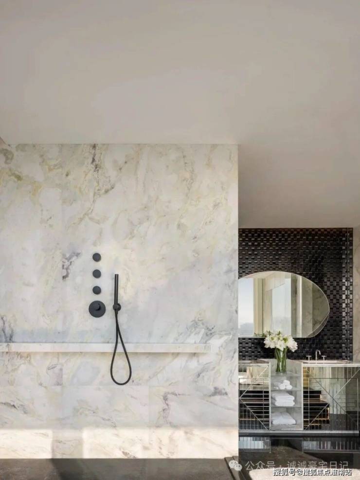 从选材来看,各种奢侈品级石材随处可见,比如与北京钓鱼台国宾馆同款的意大利进口鱼肚白石材,造价高达约2万/㎡,被誉为“世界上最贵的石材之一”!