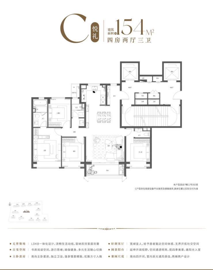 亮点:约 9.9m LDKB 一体化、四开间超 14 米、主卫配浴缸、270° 转角飘窗