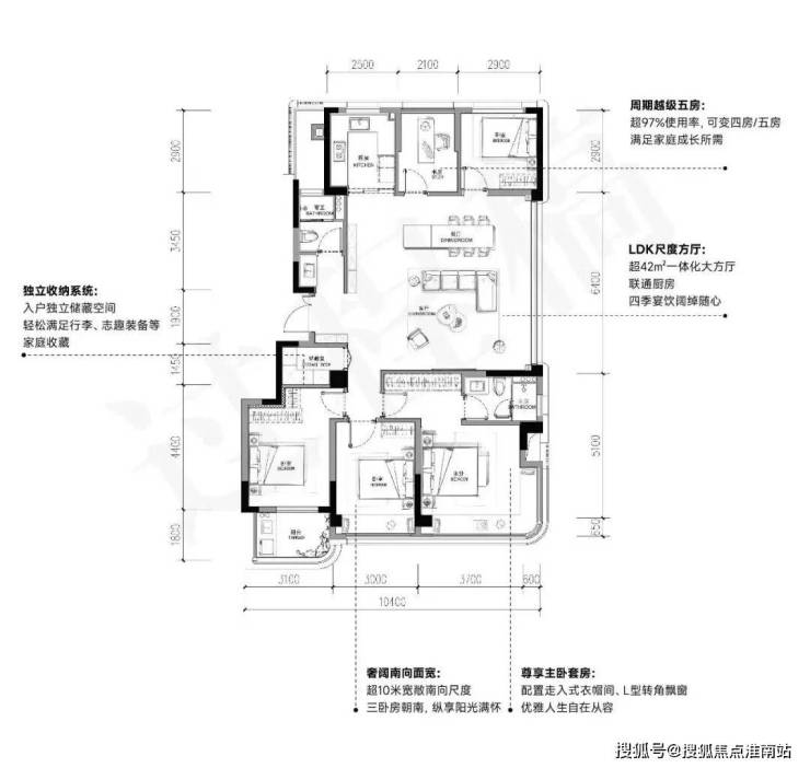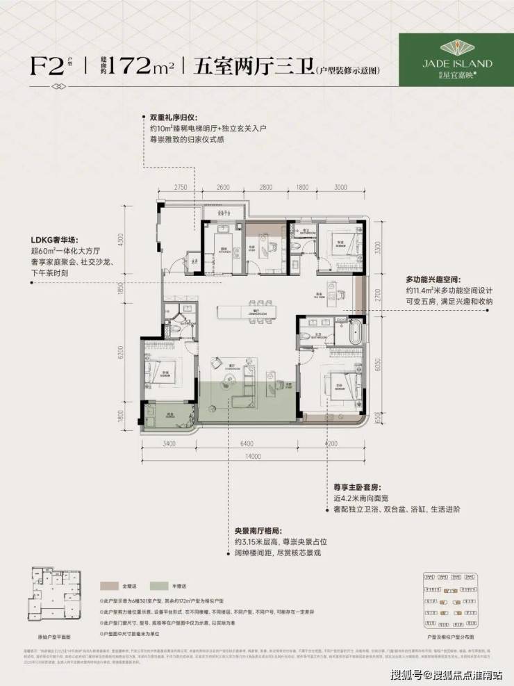 建面约172㎡:五房三卫双套房,独立电梯厅,得房率超100%(含赠送),实际使用面积远超建面,为终极改善优选。