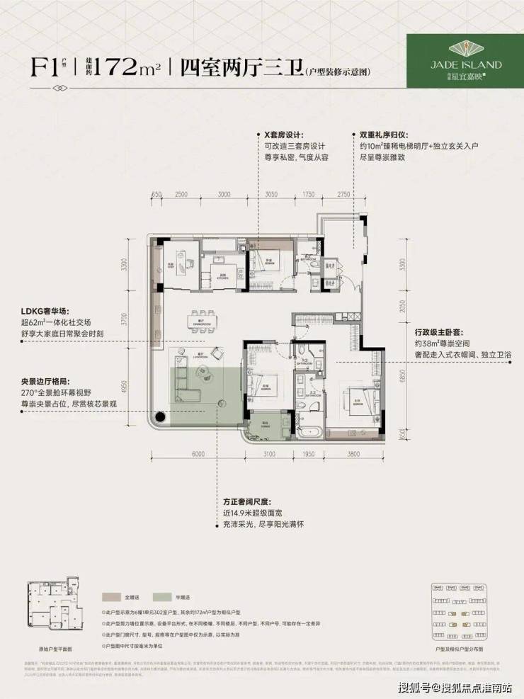 建面约172㎡F1户型,4房2厅3卫,含赠送得房率约96%。