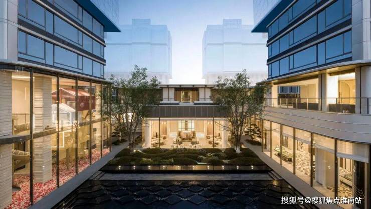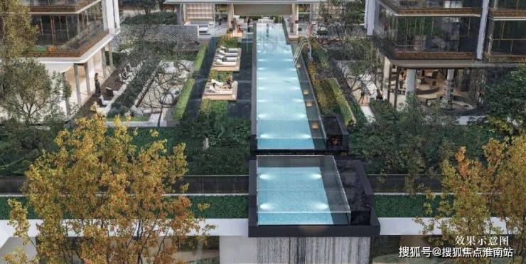 1200平米下沉式庭院,叠水成瀑,打破常规“坑洞”设计,打造上下双层平行空间,营造独特的滨水度假体验,令人一见倾心。